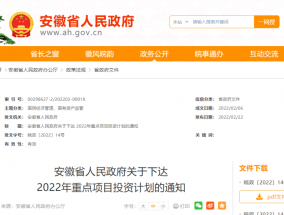 近日安徽省人民政府印发通知下达安徽省2022年重点项目投资计划 ▼安徽省人民政府关于下达2022年重点项目...