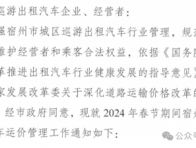 春节假期宿州市区巡游出租车临时加价2月4日宿州市交通运输局、宿州市发改委联合发布《关于调整春节市区巡游出租汽车临时加价时间的补充...