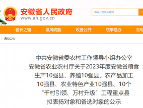 1月10日中共安徽省委农村工作领导小组办公室和安徽省农业农村厅公布拟表扬的2023年度安徽省粮食生产10强县养殖10强县农产品加...